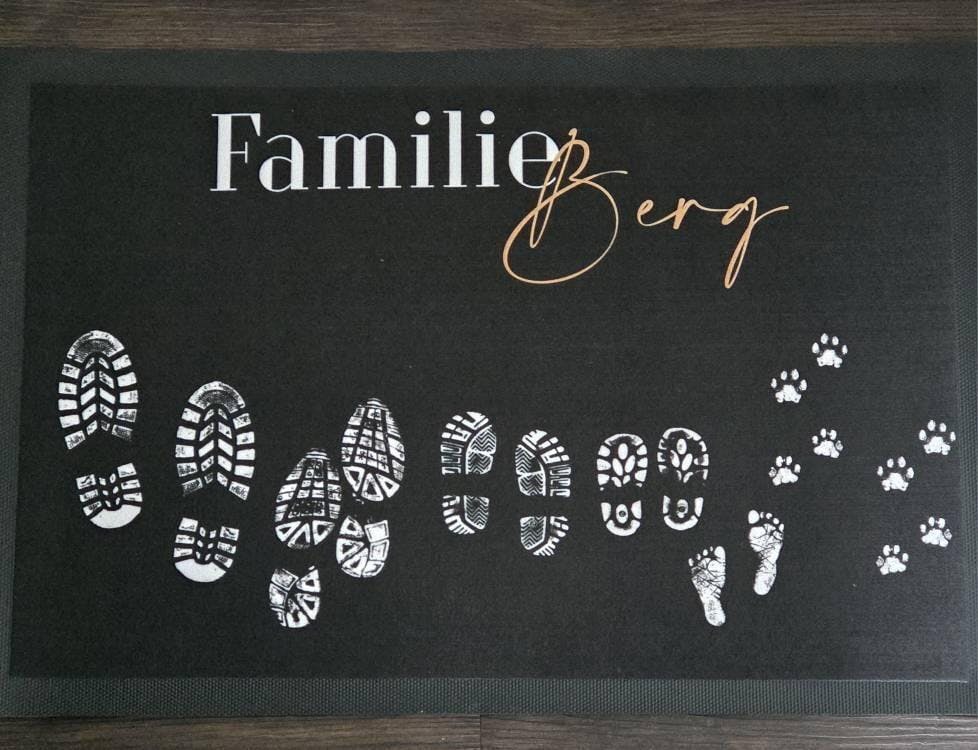 Endlich eine Deko-Fußmatte, die komplett personalisierbar ist! Wähle deine Familienmitglieder, auch die Fellnasen, aus und erhalte deine ganz persönliche Fußmatte, die mit ihrem klassisch schlichten Design und eurem Familiennamen eure Gäste begrüßen wird.