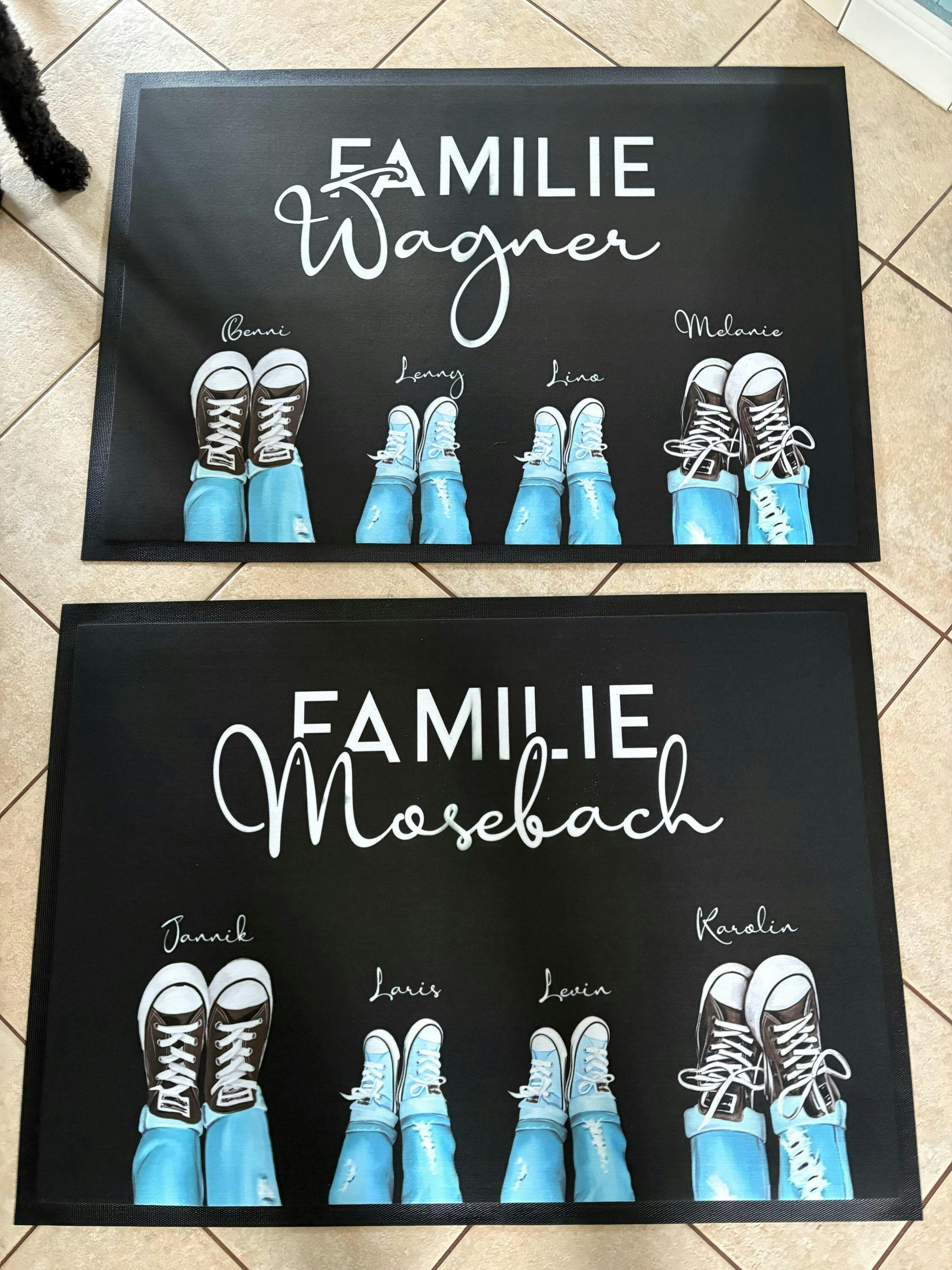 Endlich eine Fußmatte, die komplett personalisierbar ist! Wähle deine Familienmitglieder anhand der verschiedenen Sneaker mit dem dazugehörigen Buchstaben-Zahl-Kombination aus und erhalte deine eigene superschöne Fußmatte, die mit ihrem niedlichen Design eure Gäste begrüßen wird!